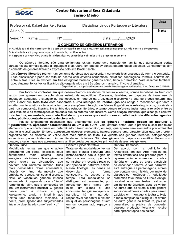 Série: 1ª Turma: ______ Nº ______ Data: ____/____/2020