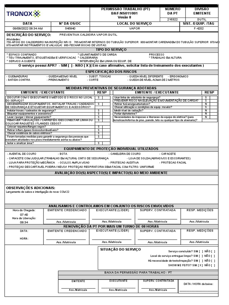 Emitente e executante(s) associados a esta PT foram alertados e ficaram cientes de que a execução de serviços de manutenção nesse equipamento requer o cumprimento