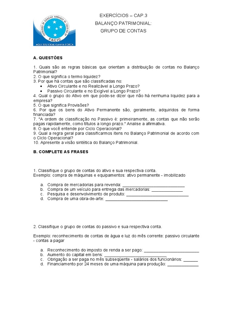 Pede-se: classificar as contas dentro de seus respectivos grupos de contas,