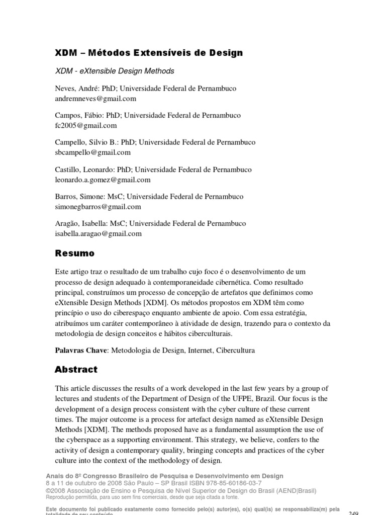XDM - eXtensible Design Methods Neves, Andr: PhD; Universidade Federal de Pernambuco andremneves@[Link] Campos, Fbio: PhD; Universidade Federal de Pernambuco fc2005@[Link] Campello, Silvio B.: PhD; Universidade Federal de Pernambuco sbcampello@[Link] Castillo, Leonardo: PhD; Universidade Federal de Pernambuco [Link]@[Link] Barros, Simone: MsC; Universidade Federal de Pernambuco simonegbarros@[Link] Arago, Isabella: MsC; Universidade Federal de Pernambuco [Link]@[Link]