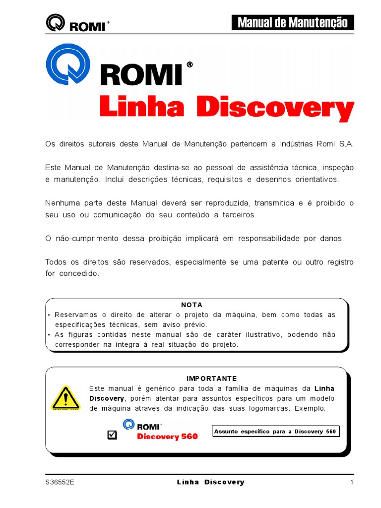 Os direitos autorais deste Manual de Manutenção pertencem a Indústrias Romi S.A.