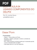 ATIVIDADES PARA ENTREGAR: ATIVIDADE 1 1) Criar na pasta Delphi uma pasta chamada Calculo Massa Corporea 2) Abrir o delphi 3) No formulrio que ser aberto arrumar as seguintes propriedades Name: FMassaCorporea Caption: Clculo da Massa Corporea Color: escolha uma cor 4) Salvar o projeto e o formulrio : Ir em File->Save All. Procurar a sua pasta e em nome do arquivo colocar UMassaCorporea e clicar em Salvar. Na janela para salvar o projeto colocar em nome do arquivo MassaCorporea e clicar em Salvar 5) Acrescentar os seguintes componentes no form FMassaCorporea e arrumar as propriedades respectivas conforme mostra o quadro abaixo :
