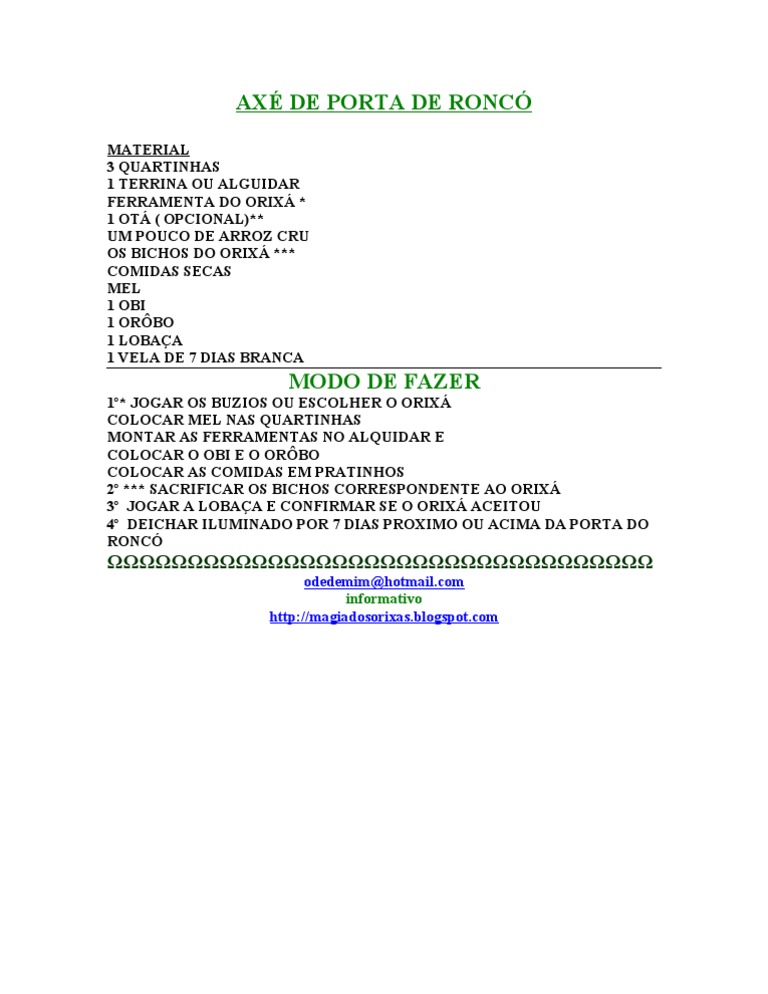 1* JOGAR OS BUZIOS OU ESCOLHER O ORIX COLOCAR MEL NAS QUARTINHAS MONTAR AS FERRAMENTAS NO ALQUIDAR E COLOCAR O OBI E O ORBO COLOCAR AS COMIDAS EM PRATINHOS 2 *** SACRIFICAR OS BICHOS CORRESPONDENTE AO ORIX 3 JOGAR A LOBAA E CONFIRMAR SE O ORIX ACEITOU 4 DEICHAR ILUMINADO POR 7 DIAS PROXIMO OU ACIMA DA PORTA DO RONC