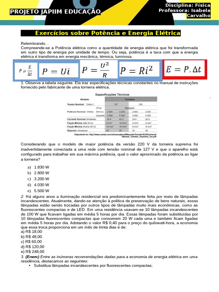 com quatro pessoas, a potência elétrica de cada equipamento e o tempo mensal de