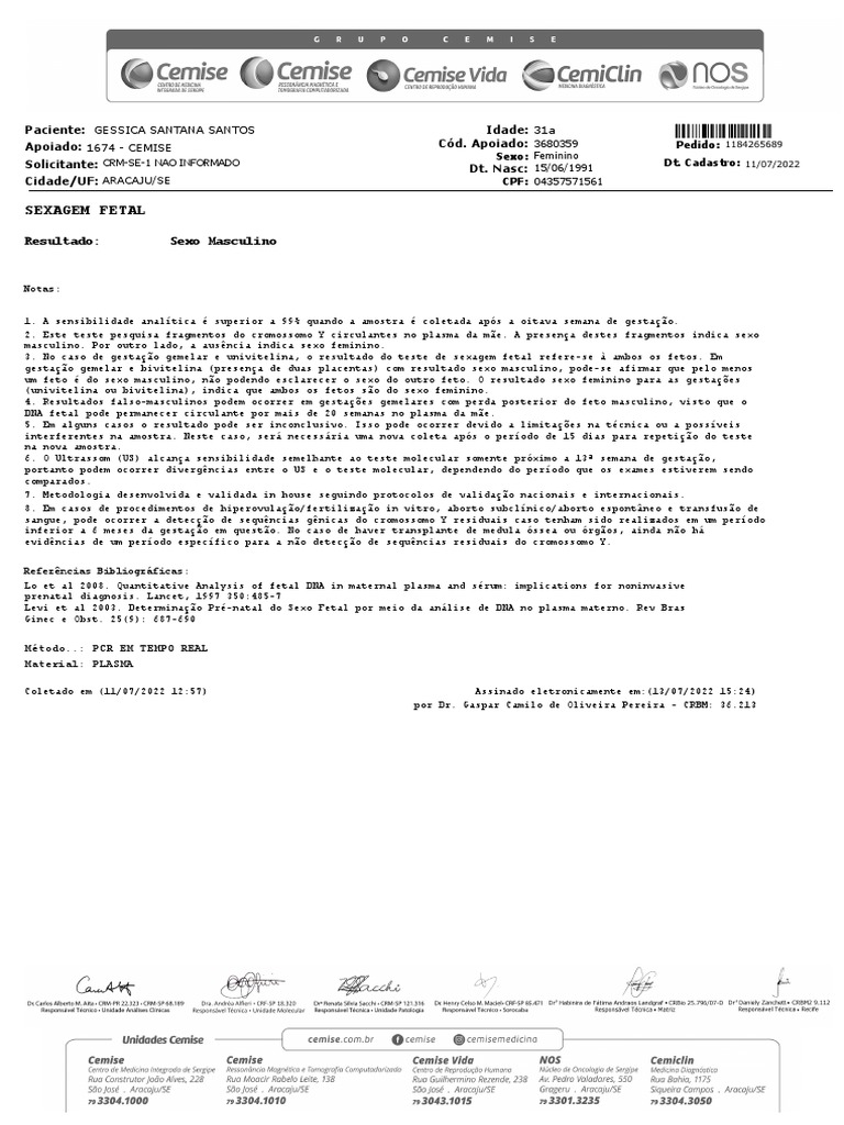 um feto é do sexo masculino, não podendo esclarecer o sexo do outro feto. O resultado sexo feminino para as gestações