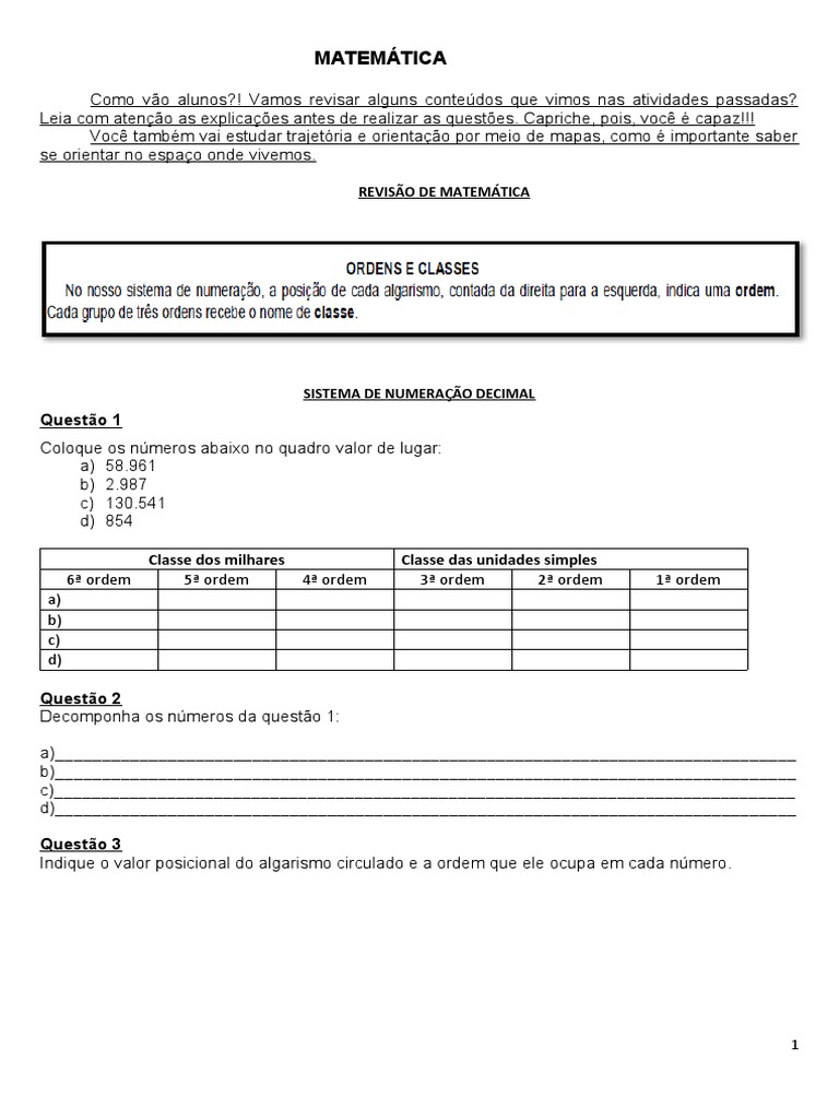 Indique o valor posicional do algarismo circulado e a ordem que ele ocupa em cada número.