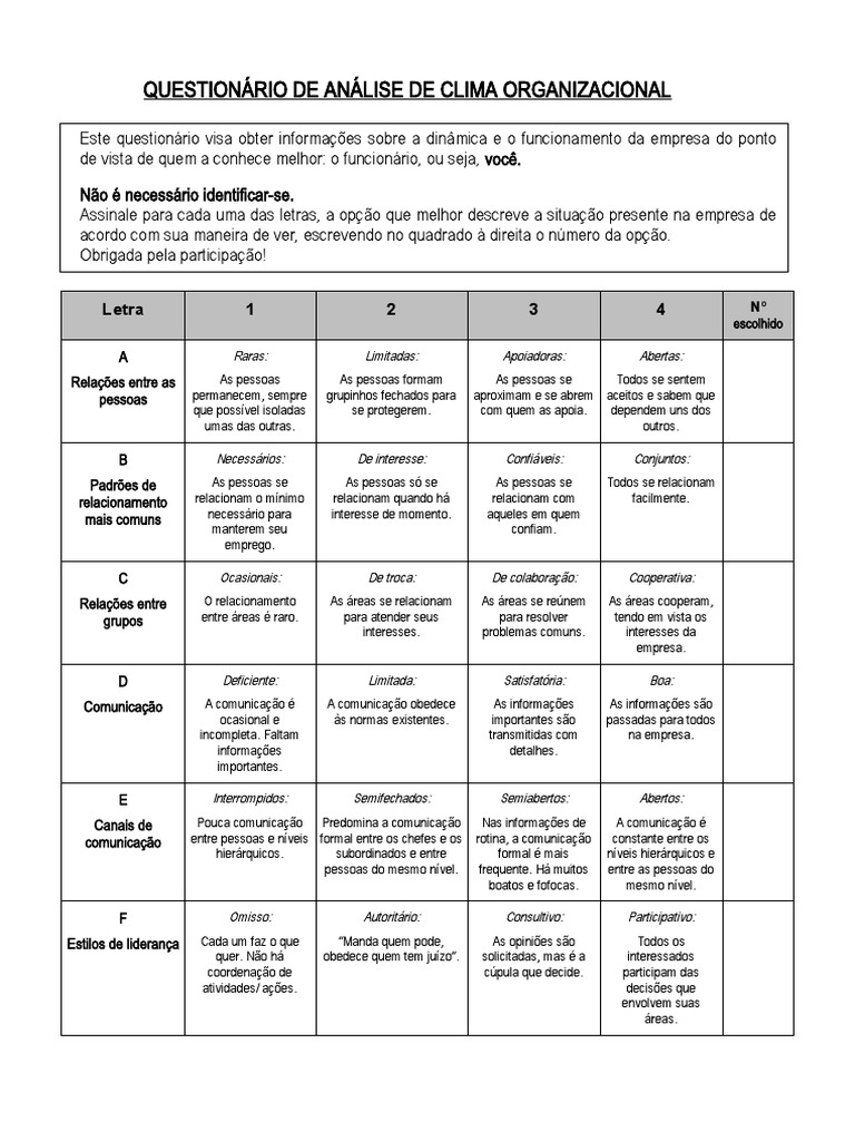 QUESTIONÁRIO DE ANÁLISE DE CLIMA ORGANIZACIONAL
