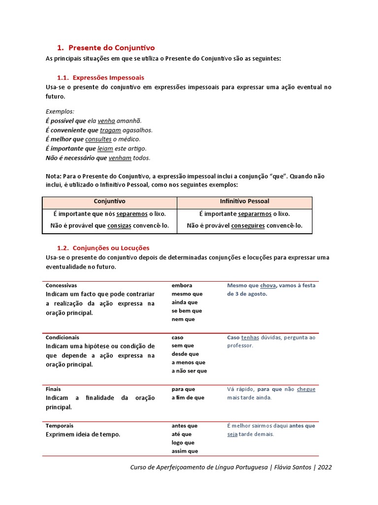 Nota: Para o Presente do Conjuntivo, a expressão impessoal inclui a conjunção “que”. Quando não