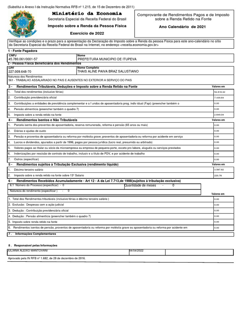 Ministério da Economia Comprovante de Rendimentos Pagos e de Imposto