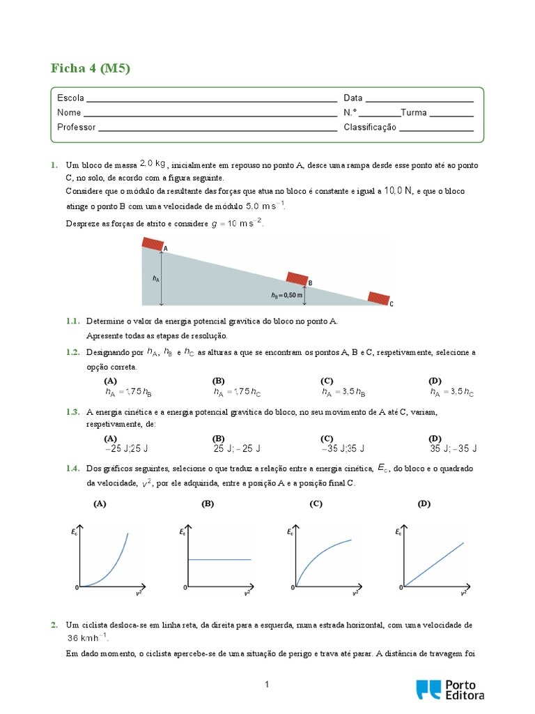 1. Um bloco de massa , inicialmente em repouso no ponto A, desce uma rampa desde esse ponto até ao ponto