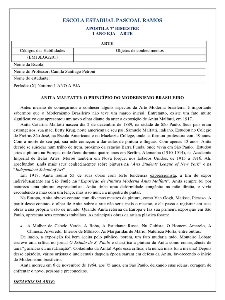 1) Quem foi Anita Malfatti? Fale sobre a artista.