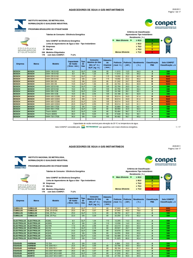 INSTITUTO NACIONAL DE METROLOGIA, www.inmetro.gov.br www.inmetro.gov.br NORMALIZAO E QUALIDADE INDUSTRIAL www.inmetro.gov.br PROGRAMA BRASILEIRO DE ETIQUETAGEM www.inmetro.gov.br www.inmetro.gov.br www.inmetro.gov.br Tabelas de Consumo / Eficincia Energtica Critrios de Classificao: Aquecedores Tipo Instantneo Rendimento ( % ) Selo CONPET de Eficincia Energtica Linha de Aquecedores de gua a Gs - Tipo Instantneo 20 Empresas 21 Marcas 248 Modelos Etiquetados 176 com Selo CONPET: Menos Eficiente 71,0% Consumo Mximo de Gs GN ( m3 / h ) GLP ( kg / h ) 3,37 2,74 2,90 2,90 2,90 3,60 3,60 3,60 5,34 5,34 5,34 4,37 4,37 4,37 6,48 5,67 Dimetro da Chamin ( mm ) 60 60 60 60 60 60 60 60 100 100 100 100 100 100 100 100