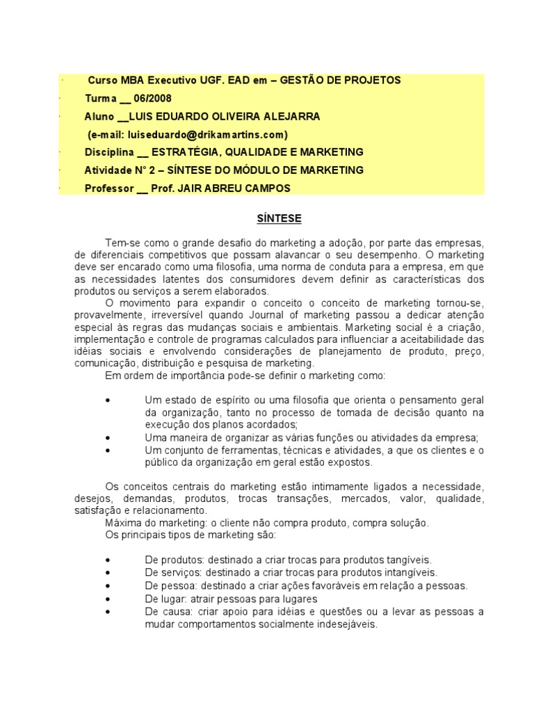 EAD em GESTO DE PROJETOS Turma __ 06/2008 Aluno __LUIS EDUARDO OLIVEIRA ALEJARRA (e-mail: luiseduardo@drikamartins.com) Disciplina __ ESTRATGIA, QUALIDADE E MARKETING Atividade N 2 SNTESE DO MDULO DE MARKETING Professor __ Prof. JAIR ABREU CAMPOS SNTESE Tem-se como o grande desafio do marketing a adoo, por parte das empresas, de diferenciais competitivos que possam alavancar o seu desempenho. O marketing deve ser encarado como uma filosofia, uma norma de conduta para a empresa, em que as necessidades latentes dos consumidores devem definir as caractersticas dos produtos ou servios a serem elaborados. O movimento para expandir o conceito o conceito de marketing tornou-se, provavelmente, irreversvel quando Journal of marketing passou a dedicar ateno especial s regras das mudanas sociais e ambientais. Marketing social a criao, implementao e controle de programas calculados para influenciar a aceitabilidade das idias sociais e envolvendo consideraes de planejamento de produto, preo, comunicao, distribuio e pesquisa de marketing. Em ordem de importncia pode-se definir o marketing como: Um estado de esprito ou uma filosofia que orienta o pensamento geral da organizao, tanto no processo de tomada de deciso quanto na execuo dos planos acordados; Uma maneira de organizar as vrias funes ou atividades da empresa; Um conjunto de ferramentas, tcnicas e atividades, a que os clientes e o pblico da organizao em geral esto expostos.