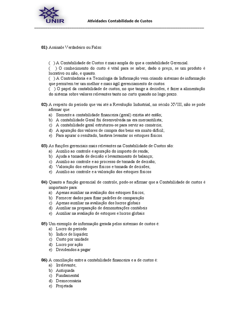 ( ) A Contabilidade de Custos é mais ampla do que a contabilidade Gerencial.