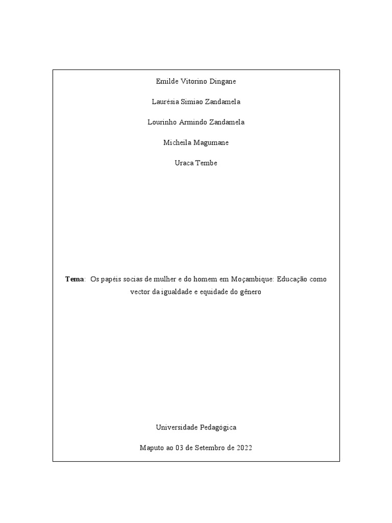 Tema: Os papéis socias de mulher e do homem em Moçambique: Educação como