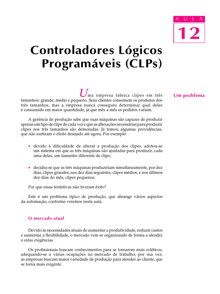 ma empresa fabrica clipes em trs tamanhos: grande, mdio e pequeno. Seus clientes consomem os produtos dos trs tamanhos, mas a empresa nunca conseguiu determinar qual deles consumido em maior quantidade, j que ms a ms os pedidos variam. A gerncia de produo sabe que suas mquinas so capazes de produzir apenas um tipo de clipe de cada vez e que as alteraes necessrias para produzir clipes nos trs tamanhos so demoradas. J tomou algumas providncias, que no surtiram o efeito desejado at agora. Por exemplo: devido dificuldade de alterar a produo dos clipes, adotou-se um sistema em que as trs mquinas so ajustadas para produzir, cada uma delas, um tamanho diferente de clipe; decidiu-se que as trs mquinas produziriam simultaneamente, por dez dias, clipes grandes; nos dez dias seguintes, clipes mdios, e nos ltimos dez dias do ms, clipes pequenos. Por que essas tentativas no tiveram xito? Este um problema tpico de produo, que abrange vrios aspectos da automao, conforme veremos nesta aula.