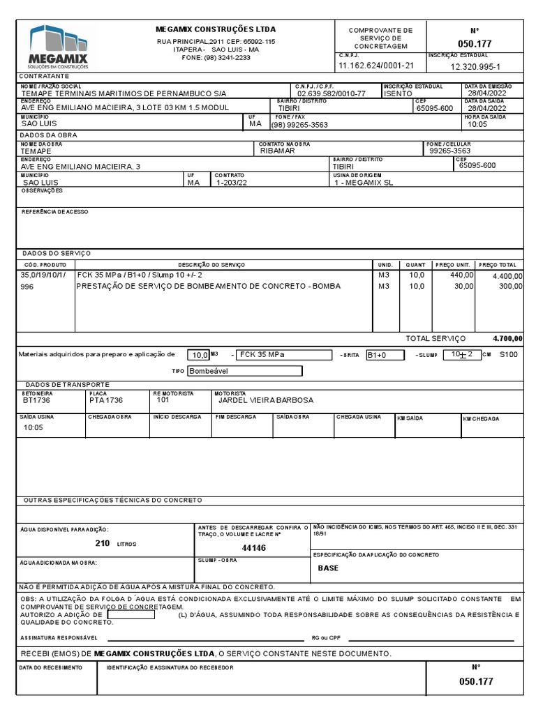 RECEBI (EMOS) DE MEGAMIX CONSTRUÇÕES LTDA, O SERVIÇO CONSTANTE NESTE DOCUMENTO.