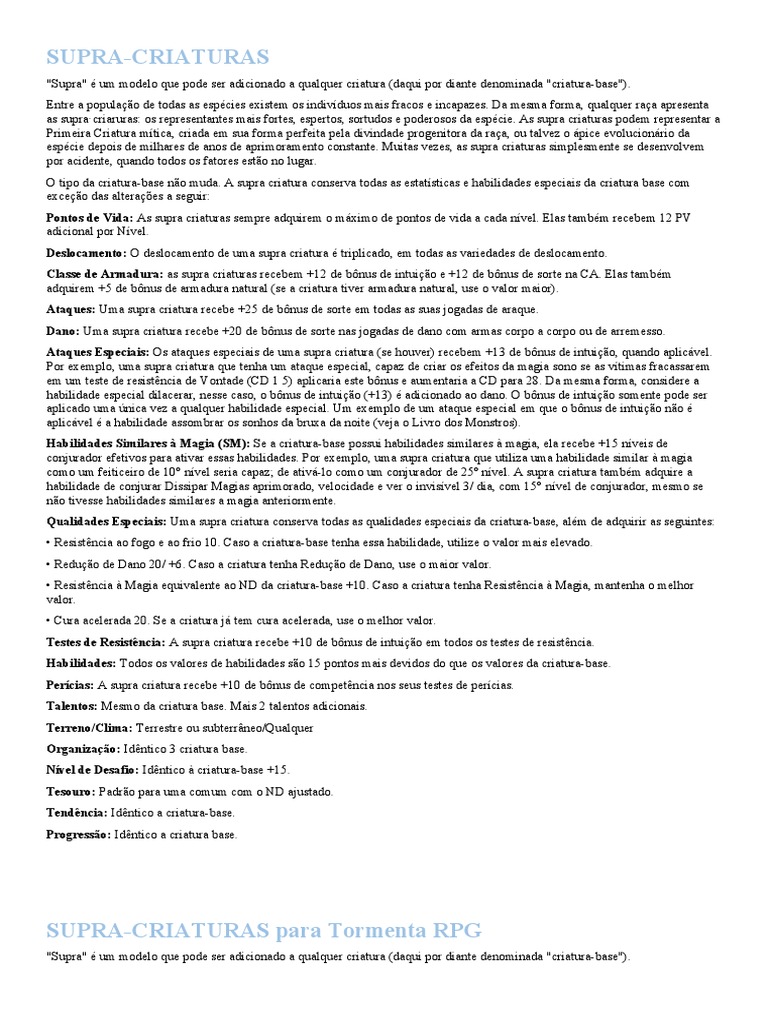 Qualidades Especiais: Uma supra criatura conserva todas as qualidades especiais da criatura-base, além de adquirir as seguintes: