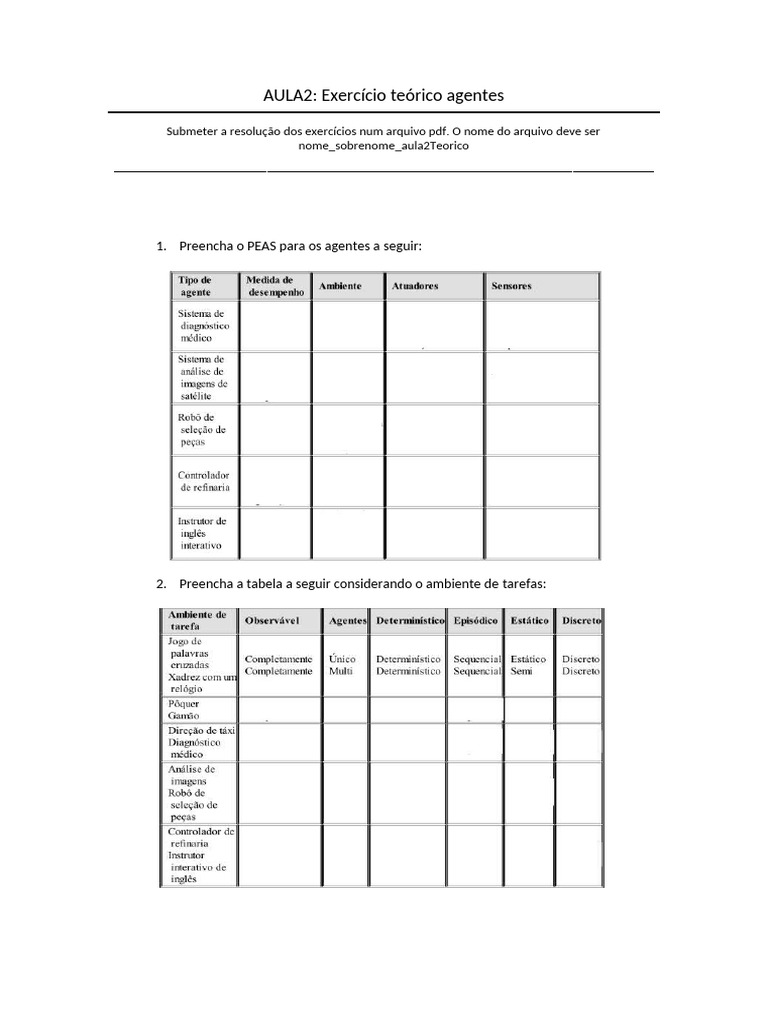 2. Preencha a tabela a seguir considerando o ambiente de tarefas: