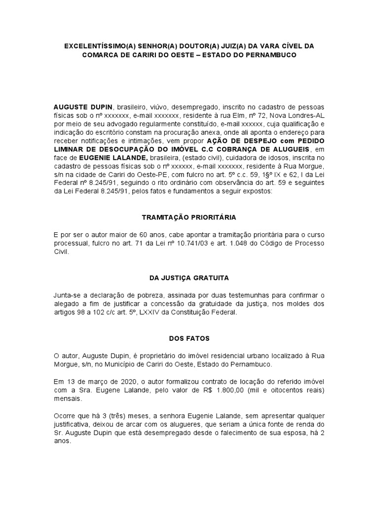 O autor, Auguste Dupin, é proprietário do imóvel residencial urbano localizado à Rua