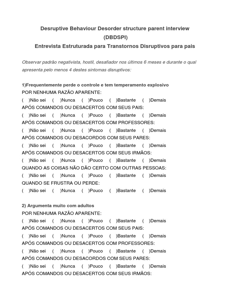 Entrevista Estruturada para Transtornos Disruptivos para pais