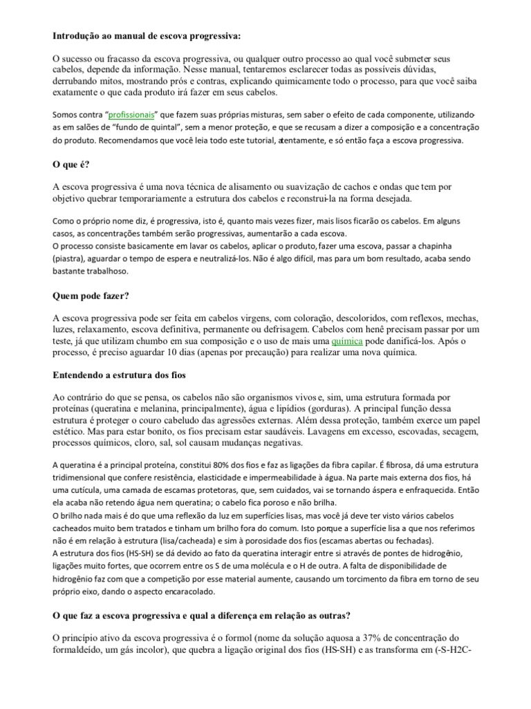 Somos contra profissionais que fazem suas prprias misturas, sem saber o efeito de cada componente, utilizandoas em sales de fundo de quintal , sem a menor proteo, e que se recusam a dizer a composio e a concentrao do produto. Recomendamos que voc leia todo este tutorial, atentamente, e s ento faa a escova progressiva.