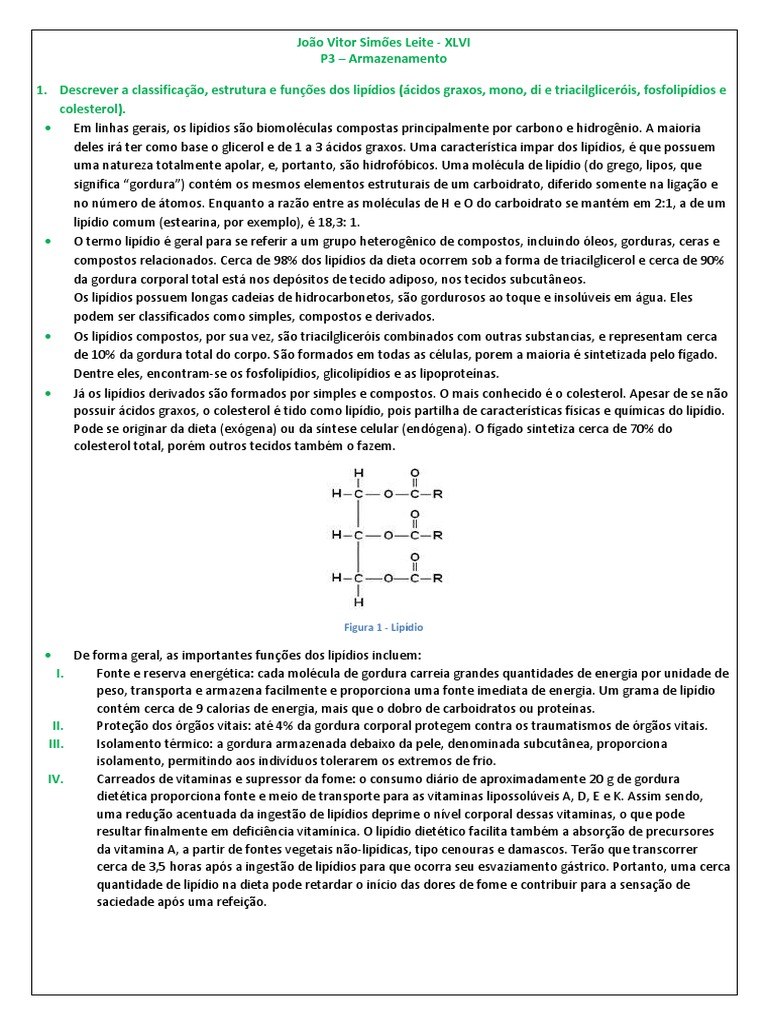 1. Descrever a classificação, estrutura e funções dos lipídios (ácidos graxos, mono, di e triacilgliceróis, fosfolipídios e