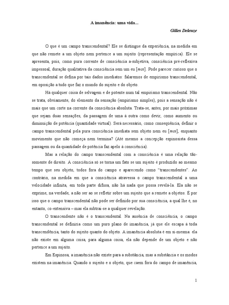 A imanncia: uma vida... Gilles Deleuze O que um campo transcendental?