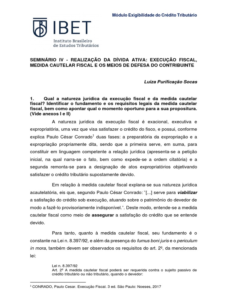 1. Qual a natureza jurídica da execução fiscal e da medida cautelar