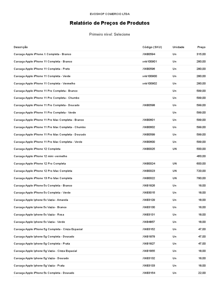 Descrição Código (SKU) Unidade Preço