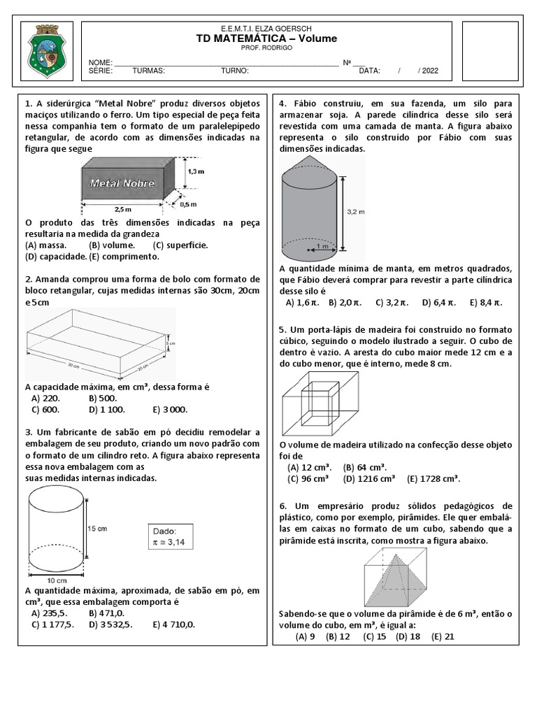 1. A siderúrgica “Metal Nobre” produz diversos objetos 4. Fábio construiu, em sua fazenda, um silo para