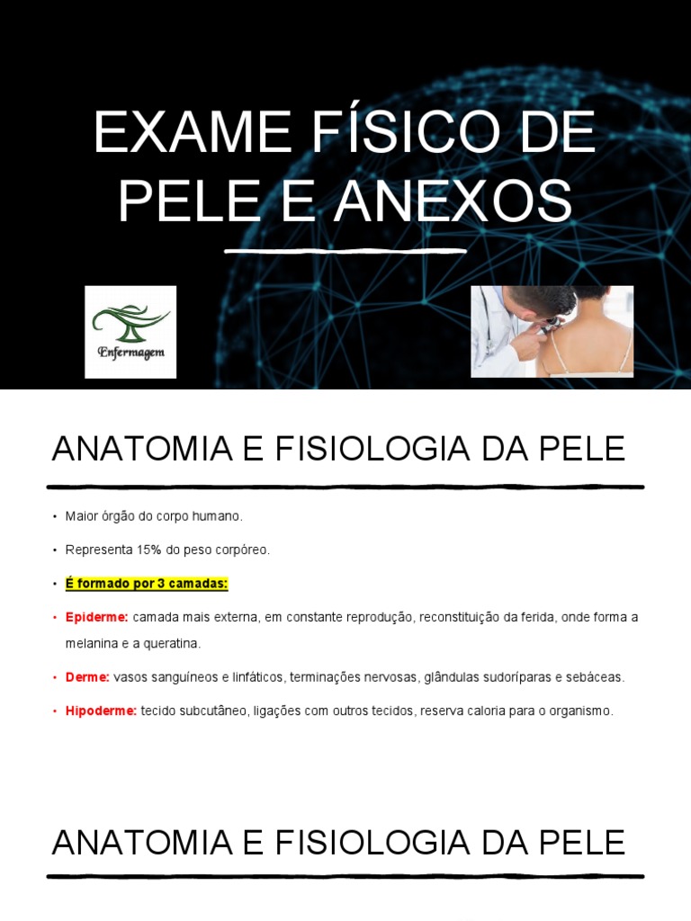 • Inspeção: de lesões, de toda a pele, das mucosas e dos anexos.