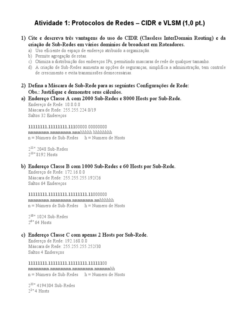 1) Cite e descreva três vantagens do uso do CIDR (Classless InterDomain Routing) e da