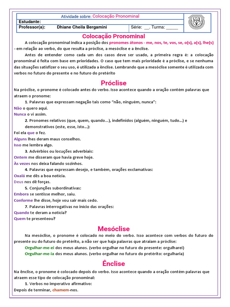 Atividade sobre: Colocação Pronominal