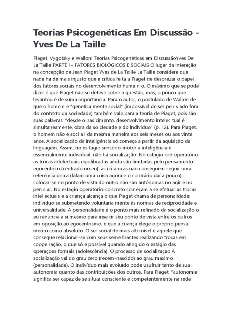 na concepção de Jean Piaget Yves de La Taille La Taille considera que