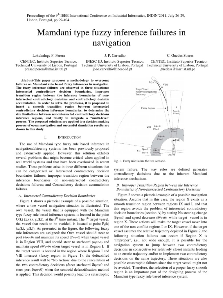 Boundaries of Non-Intersected Contradictory Decisions Figure 2 shows a pictorial example of a possible navigation situation. Assume that in this case, the region X exists as a smooth transition region between regions IX and I, and that this region avoids the problem of intersected contradictory decision boundaries (section A) by stating No steering change ( o=0) and speed decrease ( Vo<0) while target vessel is in region X. These actions will make the target vessel move into one of the non-conflict regions I or IX. However, if the target vessel assumes the relative trajectory depicted in Figure 2, the following situation failures can occur: if Region X is “improper”, i.e., not wide enough, it is possible for the navigation system to jump between two contradictory decisions in consecutive (or relatively close) instants leading to an erratic trajectory and/or to implement two contradictory decisions on the same trajectory. These situations are also possible catastrophic failures since the target vessel might not be avoided. Therefore, the selection of a proper fuzzy smooth region is an important part of the designing process of the Mamdani type fuzzy rule based inference system.