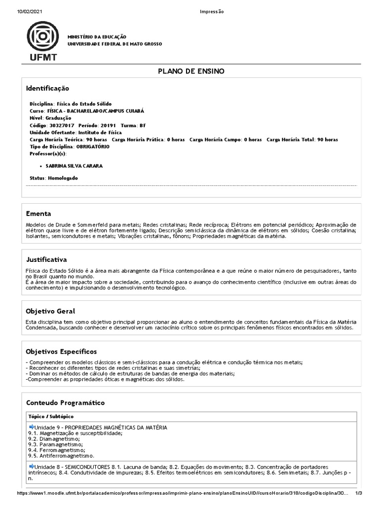 Esta disciplina tem como objetivo principal proporcionar ao aluno o entendimento de conceitos fundamentais da Física da Matéria