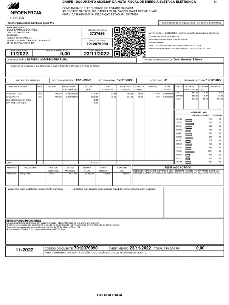 CÓDIGO DO CLIENTE 7012076090 VENCIMENTO 23/11/2022 TOTAL A PAGAR R$ 0,00