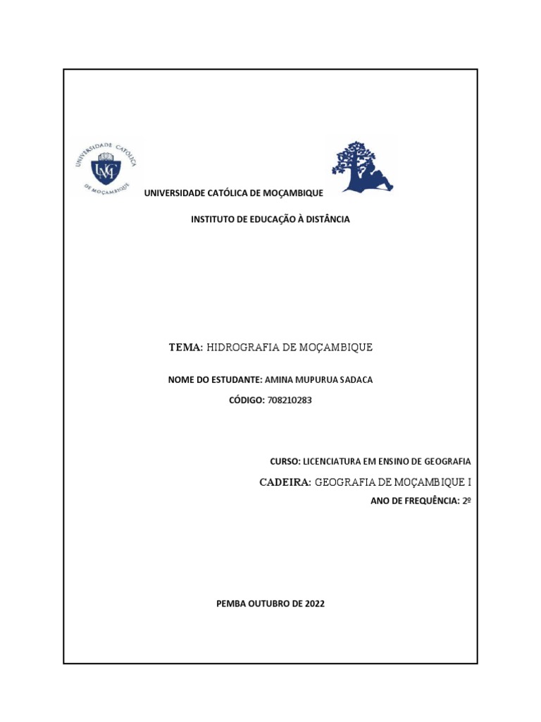 No presente trabalho da disciplina de geografia de Moçambique I, tem como tema “Hidrografia de