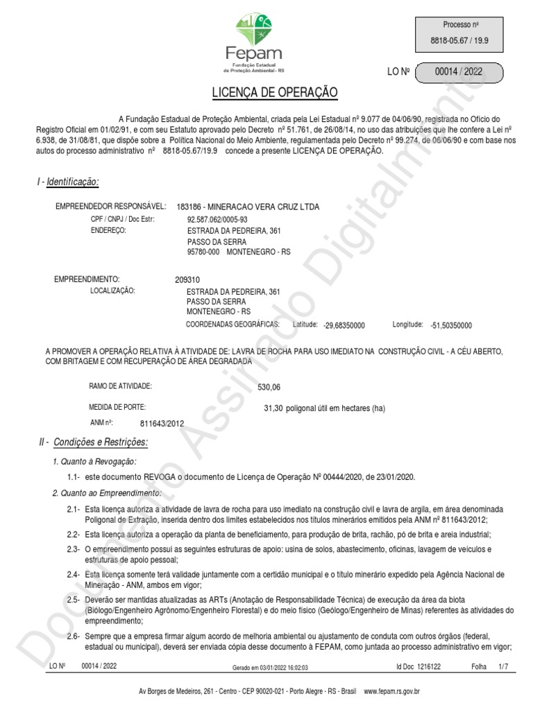 2.2- Esta licença autoriza a operação da planta de beneficiamento, para produção de brita, rachão, pó de brita e areia industrial;
