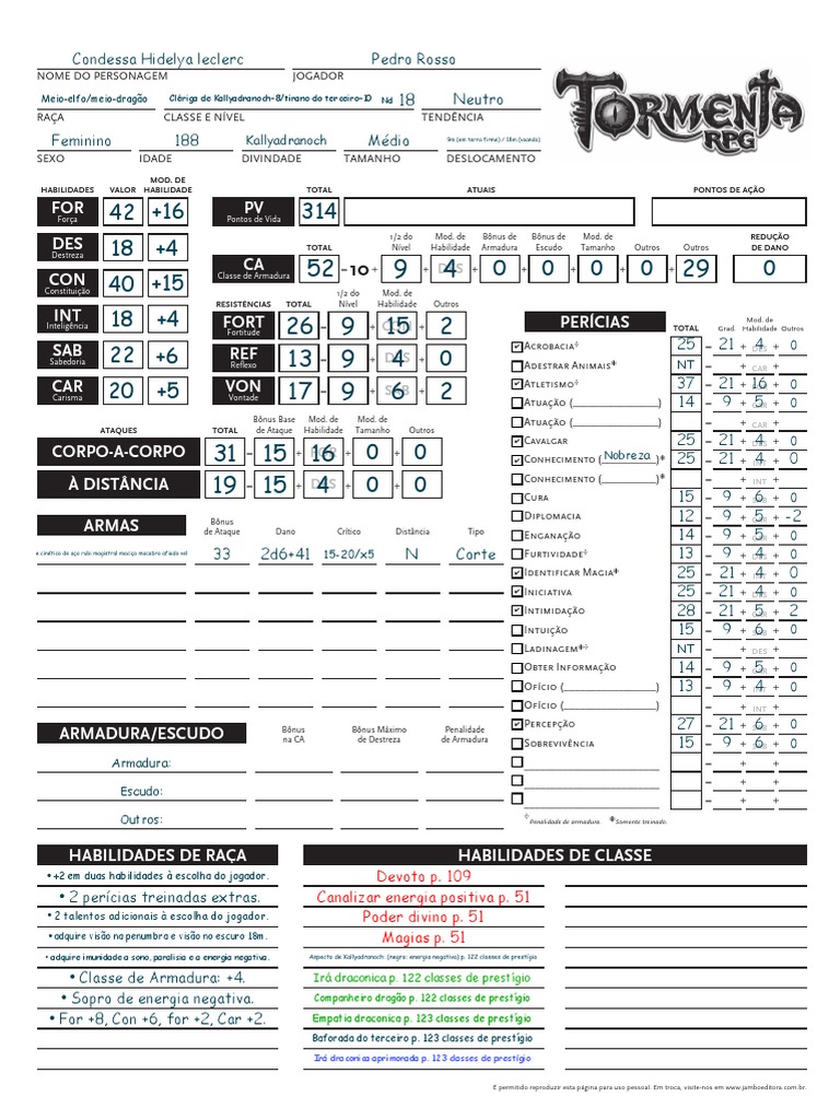 • For +8, Con +6, for +2, Car +2. Empatia draconica p. 123 classes de prestígio