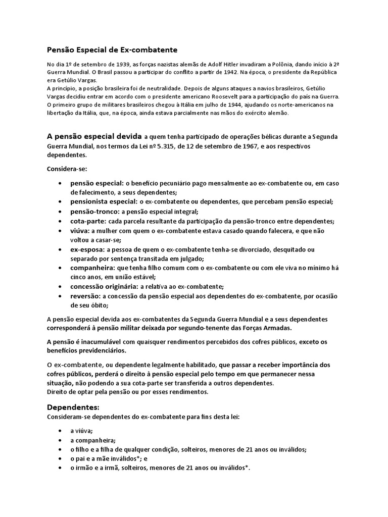 pensão especial devida aos ex-combatentes da Segunda Guerra Mundial e a seus dependentes).