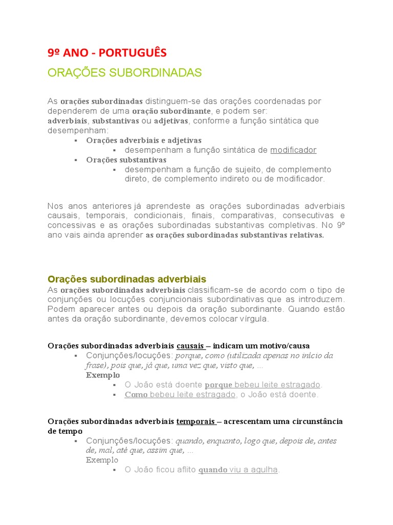 concessivas e as orações subordinadas substantivas completivas. No 9º