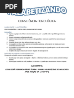 O documento descreve um jogo educacional para trabalhar a consciência fonológica em crianças. O jogo se chama "Bingo da Aliteração" e utiliza imagens de palavras que começam com o mesmo som inicia para que as crianças identifiquem a aliteração.