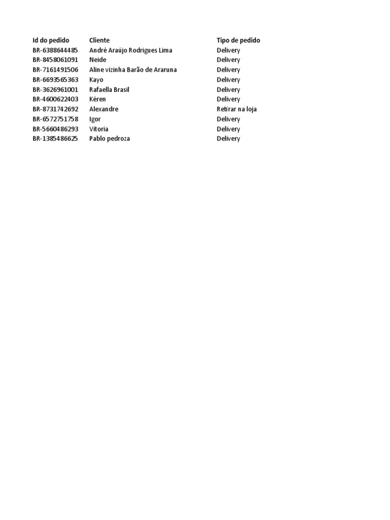 Id do pedido Cliente Tipo de pedido