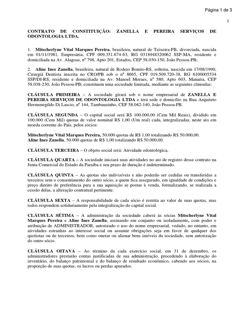 58.038-230, João Pessoa-PB; constituem uma sociedade limitada, mediante as seguintes cláusulas: