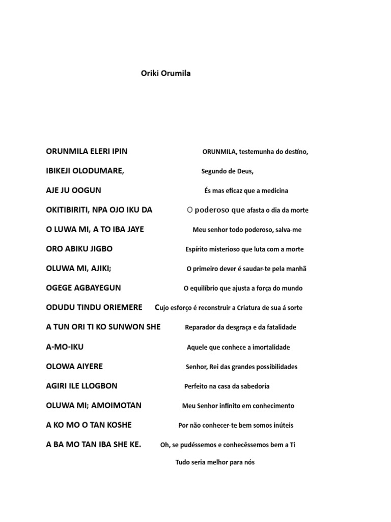 Este documento é um oriki, ou hino de louvor, para Orunmila, o orixá da adivinhação e da sabedoria. Em três frases ou menos:
