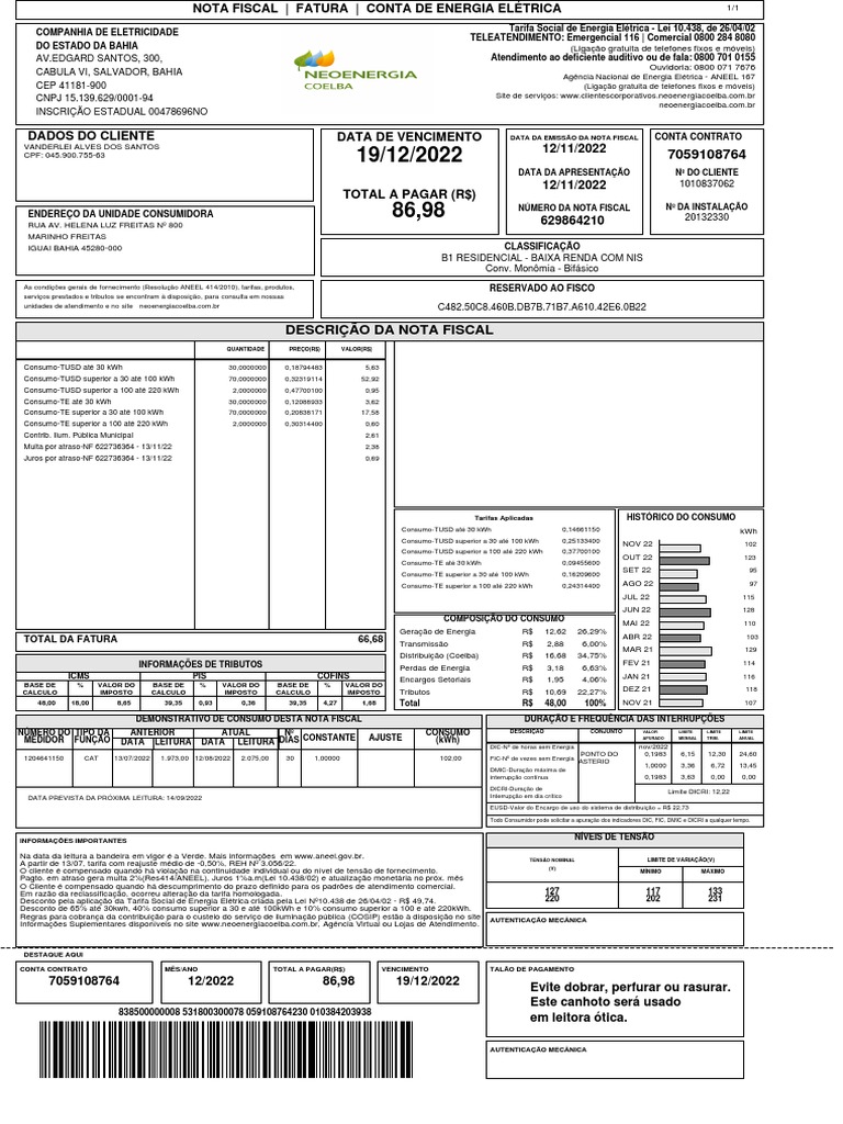 ENDEREÇO DA UNIDADE CONSUMIDORA 86,98 NÚMERO DA NOTA FISCAL