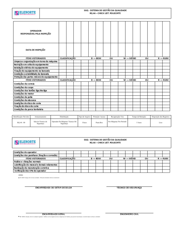 M – MÉDIO: Atenção, item em condições reguláveis - Notificar ao Encarregado da área ou Segurança do Trabalho, para possível manutenção, e somente depois continuar a atividade.