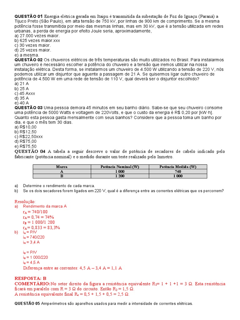 QUESTÃO 14 Um chuveiro elétrico, quando sob ddp de 220 V, é atravessado por uma corrente elétrica de